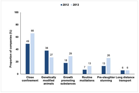 One specific farm animal welfare issue, close confinement, was an exception in terms of companies having a formal public policy on it. Almost 50% (2012) and 66% (2013) of companies published a specific policy on this issue. Most policies related, depending on the company, to the sourcing of cage-free eggs or to the sourcing of pig meat from sows who had not been constrained in sow (gestation) stalls and/or farrowing crates. It is likely that this trend has been driven by a range of factors, notably public pressure, NGO campaigns and changes in legislation in some parts of the world (e.g., the EU Pig Council Directive 2008/120/EC, which lays down minimum standards for the protection of pigs []; see also [] (pp. 101–115)). In some cases companies have made formal, public commitments to the elimination of such practices, even in the absence of an overarching farm animal welfare policy.