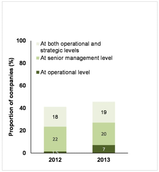 Around 40% of companies provided this information in 2012 and this percentage increased in 2013 (Figure 4). These companies specified who (i.e., the individual or the position) had operational responsibility for farm animal welfare, who at senior management or board level had oversight responsibility for farm animal welfare, or provided information on both operational and strategic responsibilities (Figure 4).