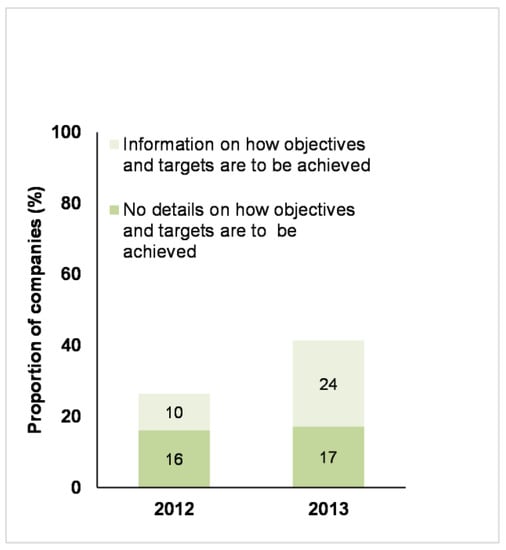 In 2013 there was an increase in the number of companies that reported that they had set farm animal welfare-related objectives and targets (Figure 5). There was also an increase in the number of these companies that provided a reasonable amount of information on how the targets were to be achieved (for example, who was responsible, what resources were allocated, what were the key steps or actions towards the target) (see Figure 5).