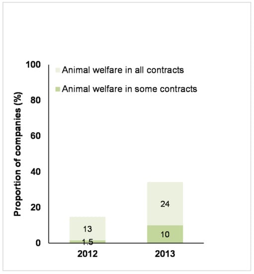 Business Benchmark on Farm Animal Welfare: the proportion of 68 companies in 2012 and 70 companies in 2013 had farm animal welfare in all or some of their supplier’s contracts.