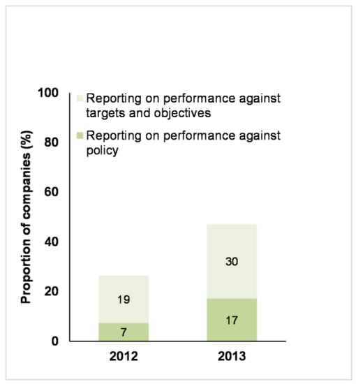 Performance reporting by companies remains relatively underdeveloped. In the 2013 Benchmark, only 17% of the 70 companies reported on how they performed against their policy commitments, and 30% reported on their performance against their objectives and targets. However, these numbers did represent increases from the 2012 Benchmark (Figure 7).