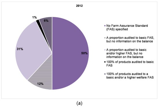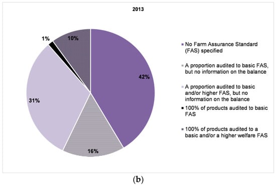 It was reassuring to find that 60% of the companies covered by the 2013 Benchmark provided at least some information on the assurance schemes (or standards) to which their animals are reared, transported and slaughtered. Assurance schemes can play an important role in promoting and applying farm animal welfare standards []. Membership of assurance schemes and the associated inspections of livestock holdings can lead to a reduced risk of non-compliance with legislation and reduced unnecessary pain or distress present on farm []. Assurance schemes also provide many of the core process elements (e.g., on auditing, on traceability) that companies need if they are to implement effective farm animal welfare management processes in their supply chains.