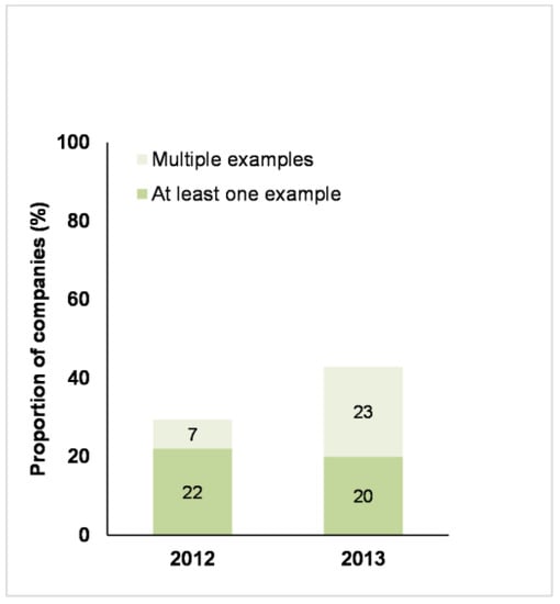 Figure 9 shows that there was an increase in the number of companies that provided information to their customers or consumers on farm animal welfare. The number of companies that presented multiple examples increased in 2013.