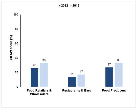 The authors declare no conflicts of interest. The 2012 and 2013 iterations of the BBFAW programme were sponsored by Compassion in World Farming and World Animal Protection, but the company analysis and interpretation of results were conducted by the independent BBFAW Secretariat. Some members of staff of both Compassion in World Farming and World Animal Protection participated in the Technical Steering Group that guided the programme, and reviewed the accuracy of some of the company assessments as part of the overall quality assurance process. These members of staff were not involved in data collection for the company assessments. The founding sponsors had no role in the writing of this manuscript, or in the statistical analysis of the data.