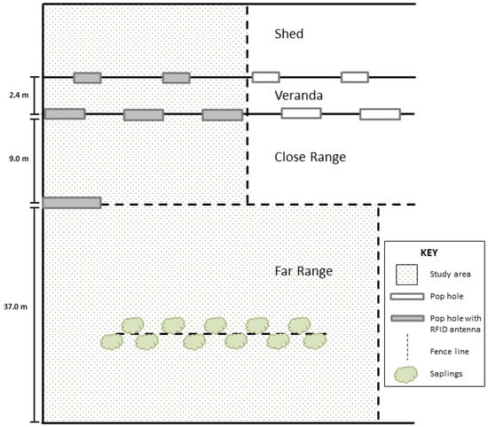 Diagram of the commercial sheds outlining the segregated study area, the three distinct outdoor zones (veranda, close range, and far range), and the location of the pop holes and RFID antennas (not to scale). Both sheds had identical indoor, pop hole, and range dimensions.