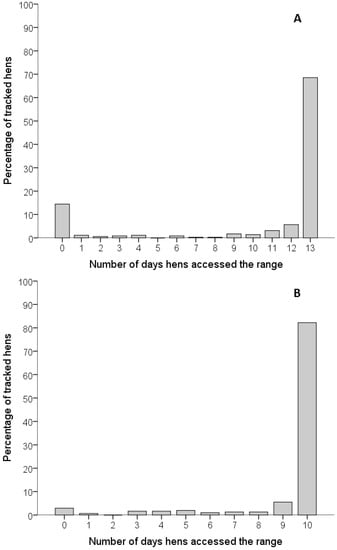 Most tracked hens in the flocks accessed the range on a regular basis (Figure 2). A total of 68.6% of hens in Flock A and 82.2% of hens in Flock B accessed the range every day during the study (13 and 10 days, respectively), with 80.7% (Flock A) and 91.3% (Flock B) of hens accessing the range on more than half the study days. Only 14.4% and 2.9% of hens never accessed the range over the course of the study in flocks A and B, respectively.