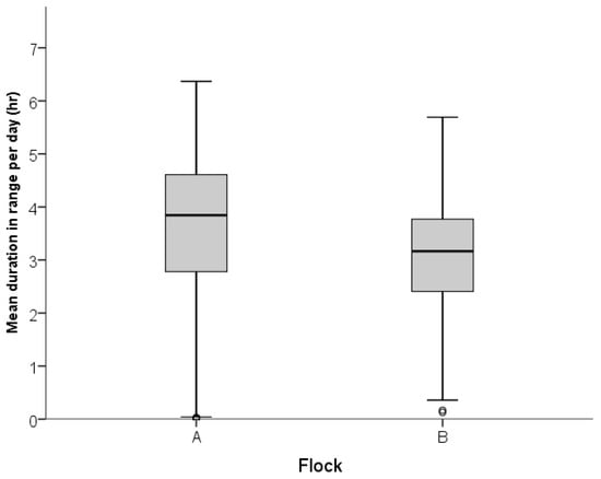 Box plot indicating the distribution of the mean daily duration on the range for individual hens in both flocks. The line in the box indicates the median for each flock, the box indicates the 1st and 3rd quartile, and the whiskers indicate the total range of values. Outliers are indicated using open circles.
