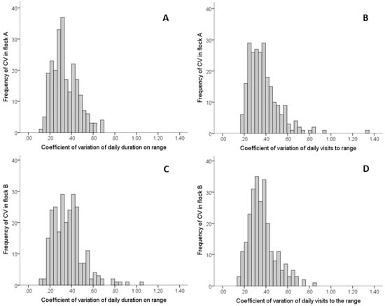 Frequency histograms of coefficient of variation for daily duration and number of visits to the range in Flock A (panels A and B, respectively) and Flock B (panels C and D, respectively) for tracked hens that accessed the range every day of the study period (Flock A = 13 days, Flock B = 10 days).