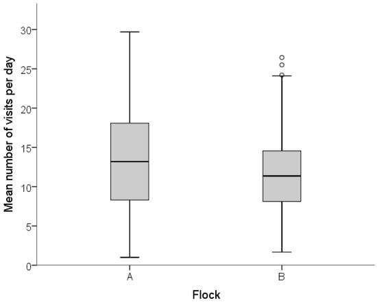 Box plot indicating the distribution of the mean daily frequency of range visits for individual hens in both flocks. The line in the box indicates the median for each flock, the box indicates the 1st and 3rd quartile, and the whiskers indicate the total range of values. Outliers are indicated using open circles.