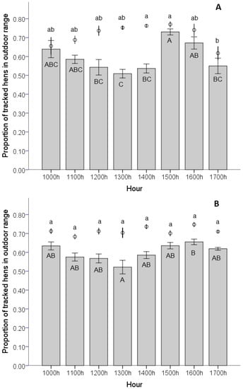 Mean proportion of hens that were outside each hour (1000–1700 h) for Flock A (A) and Flock B (B). Bars indicate the mean proportion (±SE) of the tracked hens that entered the range during that hour (rate of entry to range). Open circles (φ) indicate the mean proportion (±SE) of the tracked hens that were outside at least once during that hour but did not necessarily enter the range during that hour. Bars with different letters (A–C) indicate significant differences in the rate of entry to the range between those hours (p < 0.05), and open circles with different letters (a–b) indicate significant differences in the number of hens outside between those hours (p < 0.05).