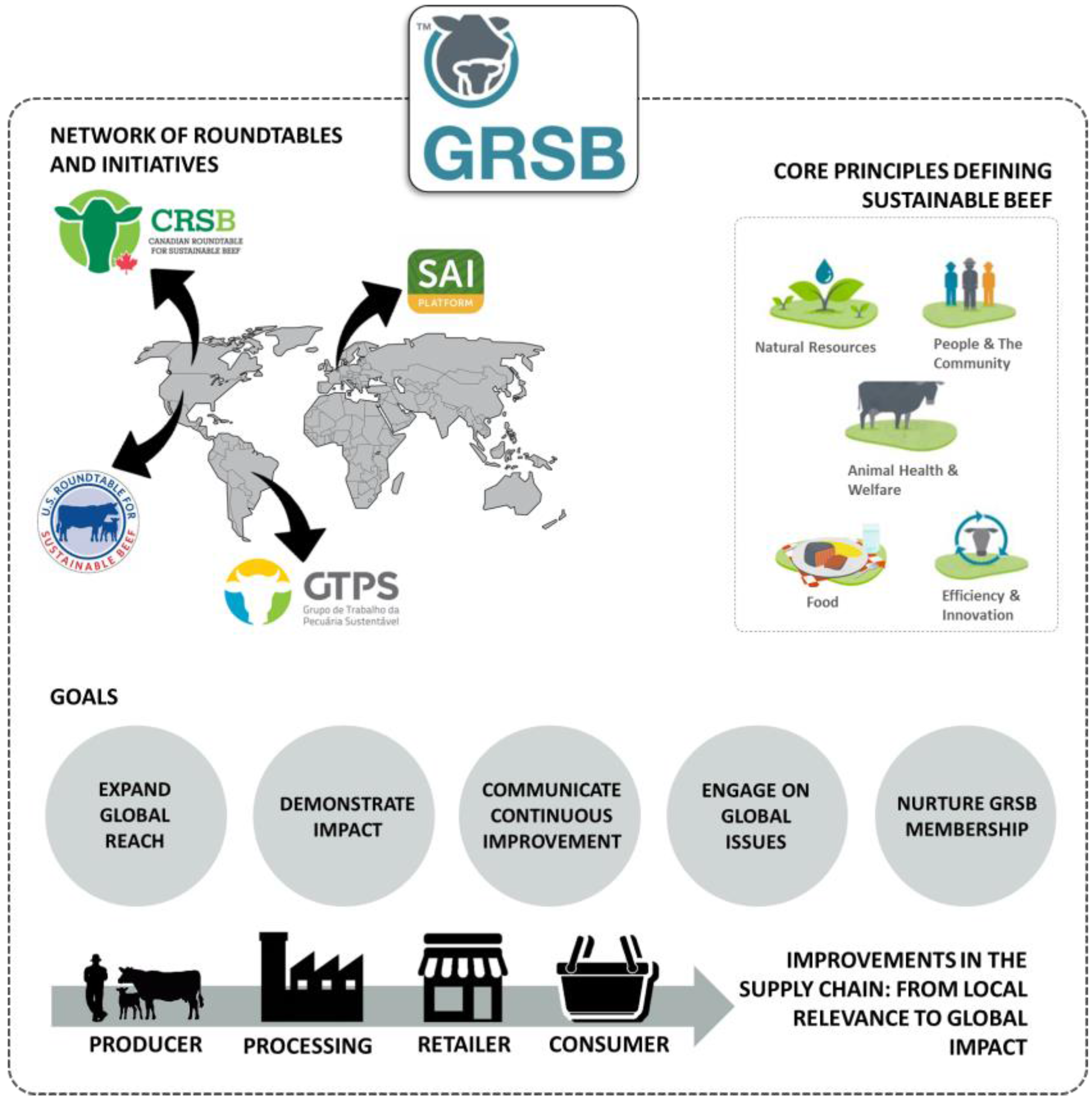 Schematic representation of the multi-stakeholder initiative, Global Roundtable for Sustainable Beef (GRSB), and associated national roundtables and initiative: (1) Canadian Roundtable for Sustainable Beef (CRSB); (2) US Roundtable for Sustainable Beef (USRSB); (3) Brazilian Roundtable on Sustainable Livestock (GTPS); and (4) Sustainable Agriculture Initiative (SAI) Platform. The figure shows GRSB core principles defining sustainable beef, and sustainability goals.