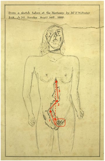 In 1966, some sketches relating to the murder of Catherine Eddowes were discovered in a basement of the London Hospital. Professor Francis Camps, an eminent pathologist with an interest in the case, published the sketches with his analysis in The London Hospital Gazette. Commenting on the fact that the victims evidenced facial congestion, died without calling out, and with possibly less blood loss than might have been expected, he suggested that strangulation—“a common practice of sexual murderers”—might have been the real cause of death [23] (p. 27). However, this was contested by the doctors of the time. For Elizabeth Stride, the cause of death was given as a severed left carotid artery and division of the trachea (windpipe); for Catherine Eddowes, haemorrhage from the left carotid artery; and for Annie Chapman, also haemorrhage [21] (pp. 109–110).