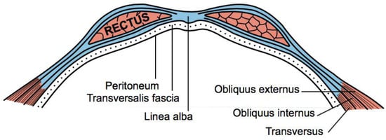 - Carter, H.V. Diagram of sheath of Rectus above the arcuate line. In Anatomy of the Human Body; Gray, H., Ed.; Lea & Febinger: Philadelphia, PA, USA; New York, NY, USA, 1918; Available online: https://commons.wikimedia.org/w/index.php?curid=4735337 (accessed on 5 February 2017).