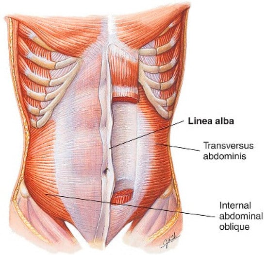 The linea alba runs the length of the abdominal midline from the xiphoid process to the pubic symphysis [10] (This article was published in Anatomy & Physiology, Thibodeau GA & Patton KT, p. 325, Copyright Elsevier (1996)).