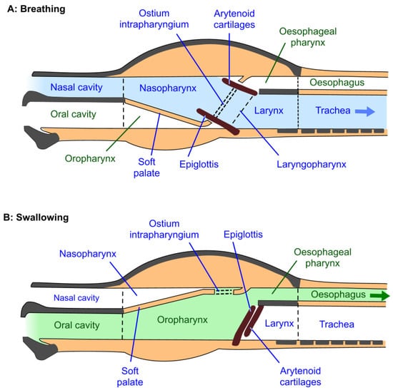 A schematic diagram of changes in pharyngeal function between the states of breathing and swallowing; derived from Cook [22] with permission. For clarity, the mouth is depicted as open and the oropharynx and oesophagus are shown as actual spaces, whereas, except during eating and drinking, the mouth is usually closed and the oropharynx and oesophagus are potential spaces only. (A) Breathing: Lowering of the soft palate seals off the oropharynx and enlarges the nasopharynx. The raised arytenoid cartilages close the oesophagus and open the larynx. The lowered epiglottis forms a seal with the soft palate. In this state, the larynx (the “button”) now fits snugly into the ostium intrapharyngium (the “buttonhole” of the pharynx). (B) Swallowing: The raised soft palate closes off the nasal cavity to prevent food and water from entering it. The arytenoid cartilages rotate down to open the oesophagus and prevent food and water from entering the larynx and trachea. Finally, the epiglottis rotates back over the arytenoid cartilages.