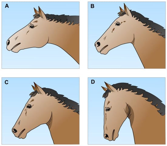 Diagrams based on photographs of horses engaged in different activities whilst wearing bitted bridles (not shown) and displaying different jowl angles: (A) derived from Gerring [50]; and (B–D) derived from Cook [22] who quantified nasopharyngeal areas from radiographs of the same conscious horse at different jowl angles, and compared them with the area at an extended angle. (A) Head-neck position of a galloping racehorse with low rein tension showing an extended jowl angle of about 125° observed in some animals when strenuous exercise has continued for several minutes. This jowl angle straightens and widens the diameter of the upper airway, resulting in a smooth (creaseless) “throatlatch”. However, the slightly open mouth, often seen when bitted bridles are worn [36,37,62,63], breaks the lip seal. In the remaining three examples traction was applied to the interdental space (diastema) via rein tension; this often leads to the mouth being wide open, although here it is shown as slightly open. (B) A galloping racehorse. The jowl angle is about 87°, close to the 90° resting neutral position, yet the nasopharyngeal area is reduced to about 90% of that at an extended head-neck position (e.g., A), potentially representing a significant impediment to maximal airflow. Note that the “throatlatch” is creased. (C) A show jumper. The jowl angle is about 75°, leading to a reduction in the nasopharyngeal area to about 55% of an extended position (e.g., A), representing a major hindrance to airflow. The “throatlatch” is considerably creased. Note that many show jumpers are expected to perform with significantly lower jowl angles than this [22]. (D) A dressage horse. The jowl angle is about 33° and the nasal bone is vertical to the ground. The degree of airway obstruction will be proportionately much greater than that depicted in C. Note the multiple creases in the “throatlatch”. Many dressage horses perform in a more hyperflexed position than this where the airway obstruction would be even more severe [22,59].