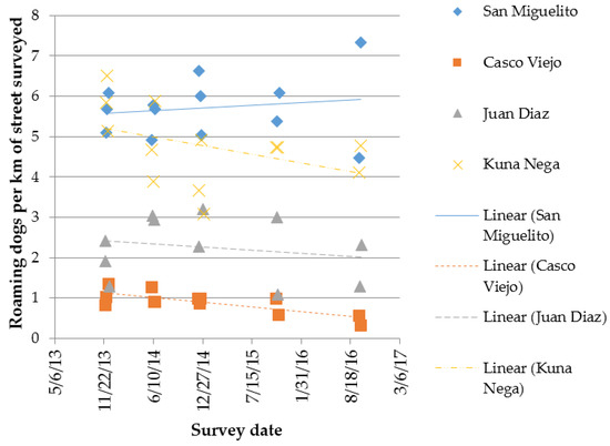Regression analysis of the data shown in Figure 4 reveals the Casco Viejo route has shown a statistically significant change in density over time, with a decreasing density of roaming dogs per km of street across the five survey events (R2 = 0.5934, p < 0.05); this route covers an area of the city that has undergone intervention over a number of years, including sterilisation of male and female dogs.
