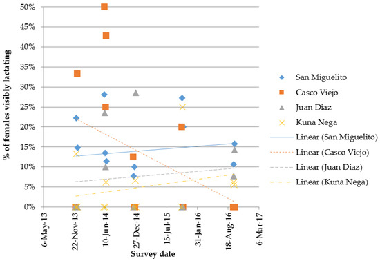 Percentage of females lactating at the time of observation; percentage for each of the four Panama City routes, at each survey event (comprised of two or three replicate surveys per route).
