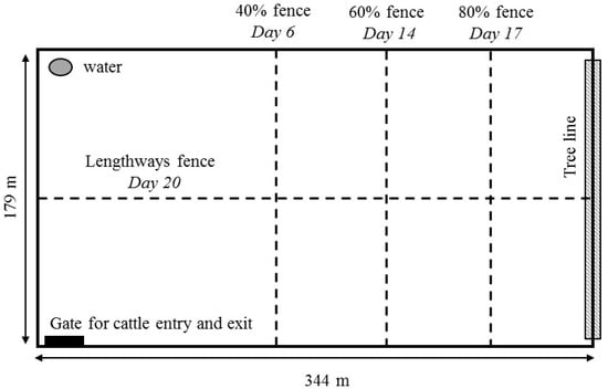 Figure 2). It is possible that the 80% fence was close enough to the tree line that the cattle were frustrated they could not access it; similarly, the lengthways fence provided access to the trees, but not their preferred corner. A physical electric fence restricting animals to different areas may have elicited similar responses, a potential control condition to be included in future experiments. Furthermore, the original group of cattle was reduced during the 60% inclusion zone, and potential changes in social structure may have led to unrest in the group. The differences that were found may have also just been due to sampling day and general variation across time, irrespective of paddock inclusion zones [
