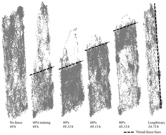 6], there was an initial learning period with the fence line and animals crossed over into the exclusion zone. After approximately 48 h, all cattle were mostly restricted within the 40% inclusion zone. However, by Day 11, 5 of the 11 cattle were regularly crossing back into the exclusion zone as their experimental prototype collars malfunctioned (this lead to a split in the herd; the cattle with functional collars correctly stayed within the inclusion zone). These five cattle were removed from the trial on Day 13, and henceforth only six cattle were used. On Day 14, the fence line was moved to restrict animals to 60% of the paddock area, on Day 17 the fence line was moved to restrict animals to 80% of the paddock area, and on Day 20 the fence line was moved to run lengthways down the centre of the paddock (a potentially more complex fencing change), thus restricting the animals to one side of the full paddock length (