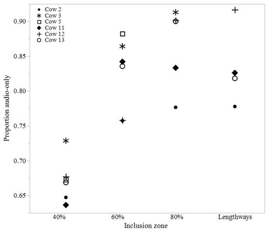 6]. Thus, potentially, this individual could have continued to exhibit a learned undesirable response, or their undesirable behaviour could have influenced others within the group, resulting in no animals learning to stay within the inclusion zone. This animal (cow # 5) surprisingly, did not show the lowest proportion of audio-only cues in the current trial (