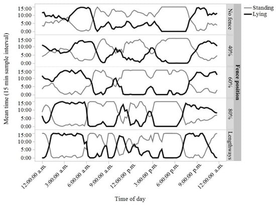 In the behavioural activity measures taken, few impacts of the virtual boundaries were found. Visually similar behavioural patterns were displayed throughout the day within the different inclusion zone periods, with animals spending approximately half of their time standing, similar to what has been observed in beef cattle at pasture ([
