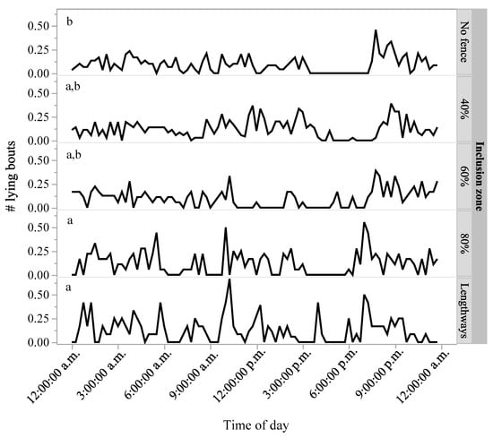 12]: half of behavioural scans were standing/grazing), although grazing behaviour was not specifically assessed by the activity monitors in this study. Cattle did show an increase in lying bouts when the fence line moved to include 80% of the paddock or a lengthways portion of the paddock compared to their baseline behavioural patterns, but these changes were incremental across the different inclusion zone periods. Total lying time did not change, and thus the changes in lying bouts only, may indicate that the cattle were slightly unsettled while adapting to the changes in their environment. During the period of no fence, the animals showed a preference for accessing the tree line at the top right end of the paddock to rest under (