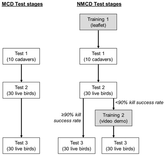 In order to assess the training requirements for NMCD and the kill efficacy of each killing method as applied by each stockworker, the 70 birds per killing method were sub-divided into three test stages in order to minimize the risk to bird welfare: Test 1—applied to 10 cadavers; Test 2—applied to 30 live conscious birds; and Test 3—applied to 30 live conscious birds (Figure 1). In Test 1, birds were euthanised immediately prior to testing in the predetermined test order with an intravenous overdose of sodium pentobarbital (Euthatal, Merial Animal Health Ltd., Essex, UK; 1 mL per kg). There was no maximum time for completion of each test, but the time for completion of each was recorded. The killing rate of birds within each test was not controlled in an attempt to reduce any stress on the stockworkers and to allow them to perform the killing methods at comfortable rates. Between tests, the stockworkers took standardized 5 min breaks. No training relating to MCD was provided prior to testing and the three tests were performed consecutively for both killing methods. As NMCD was a novel method, and one aim was to gauge the training required to apply it successfully, two training stages were included. Before Test 1, compulsory training was provided (Figure 1, Training 1), and further training was provided depending on performance in Test 2 (Training 2). Training 1 involved providing the stockworker with a leaflet which simulated the instruction manual which would accompany the device if purchased. Each stockworker was given time to read the leaflet and try on the various sizes of the gloved device (small/medium/large) in order to select the appropriate size. The stockworker was then given 10 cadavers to perform the NMCD method on. This allowed the stockworker to become accustomed (e.g., by adjusting hand grip) to the device without compromising bird welfare, although there was a lack of muscle tone compared to live birds. Kill efficacy (sufficient trauma to cadaver e.g., cervical dislocation) was recorded for each bird and at the end of Test 1 the stockworker was asked if he was comfortable to continue to the next test (on live birds). If yes, then following the 5 min break the stockworker continued on to Test 2. If no, the tests for NMCD were halted for that stockworker and no further birds were killed by that method. In Test 2, each stockworker was given 30 live and conscious birds to kill. If the overall kill efficacy (see below) was less than 90%, training stage 2 was provided before progressing to Test 3. At the end of Test 2 the stockworker was asked if he was comfortable to continue to Test 3. If yes, then following a 5 min break the stockworker continued. If no, the tests for NMCD were halted for that stockworker and no further birds were killed by that method. For each method, all three tests were performed consecutively within one session (morning (AM) or afternoon (PM)).