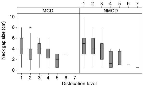 Effect of neck gap size (cm) on dislocation level (where 1 = between vertebrae C0–C1, etc.) for both killing methods. The asterisk (*) indicates an outlier.