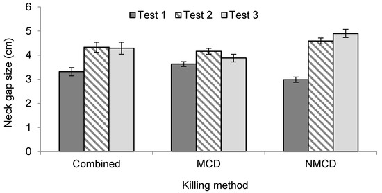 Effect of test number (p < 0.001) on neck gap size for the killing methods combined, as well as the individual killing methods.