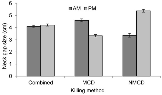 Effect of session (morning (AM) or afternoon (PM), (p < 0.001)) on neck gap size for combined and individual killing methods.