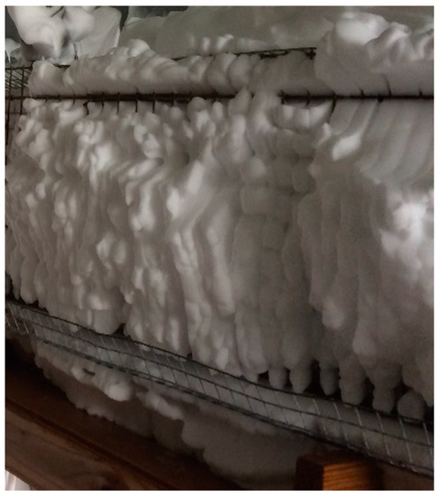 The components of a compressed air foam system (CAFS; Rowe CAFS LLC, Hope, AR, USA) were a 1982 L/m (70 cfm) rotary screw air compressor (Vanair Inc., Michigan City, IN, USA), a 29.42 kW (40 HP) gasoline engine (Kohler, Kohler, WI, USA), a 567 L/m (150 gal/m) centrifugal water pump (Hale Products, Inc., Ocala, FL, USA), and a foam proportioning unit (0.1–10%) (FoamPro, Kingston, NY, USA). The foam proportioning unit injected Class A foam concentrate (ICL Performance Products, Rancho Cucamonga, CA, USA) into the water manifold of the CAF unit to make a 3.5% foam water solution. A 1136 L (300 gal) water tank installed on the trailer bed supplied water for producing foam. A separate air manifold supplied compressed gases to the mixing chamber from the air compressor or vaporizer. The three constituents (gas, water, and foam concentrate) were agitated in the mixing chamber of the CAFS unit. Foam of a desired consistency and thickness was produced by adjusting the flow of aqueous foam solution. Foam quality was determined visually by the ability of the foam to properly fill the cage. Figure 1 and Figure 2 illustrate the consistency and thickness of foam produced during the experiment. A 6.4 cm wide and 6 m long suction hose connected to a 3.8 cm CAF system through 15 m of firefighting hose of the same diameter was used to deliver CAF to the spent hens. The foam was applied to the cages for two minutes and allowed to stay in the cages for an additional two minutes. After the end of the four-minute period, foam was washed away and hens were immediately removed from the cages.