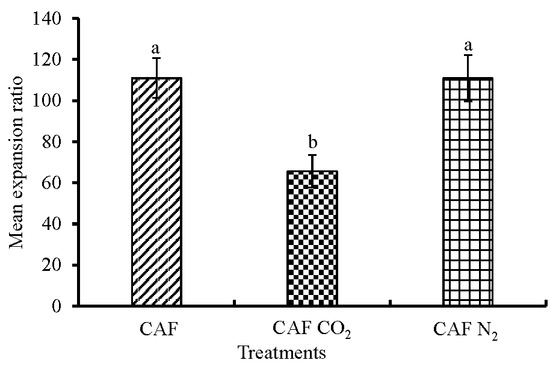 Mean expansion ratios of the three types of foam. The three foam treatments were CAF with air, CAF with CO2, and CAF with N2. The expansion ratio is the ratio of the volume of the finished foam to the volume of the aqueous foam solution. Bars (mean ± SEM) with different superscripts (a, b) are significantly different by Fisher’s LSD test (p < 0.05). The number of samples per treatment was 8.