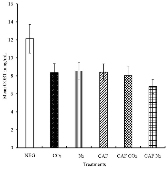 The mean CORT levels of spent hens subjected to NEG, CO2, N2, CAF, CAF CO2, and CAF N2 treatments were 12.1 ng/mL, 8.4 ng/mL, 8.5 ng/mL, 8.4 ng/mL, 8.0 ng/mL, and 6.8 ng/mL, respectively (Figure 4). The CORT values of spent hens in all six treatment groups had no significant differences (p = 0.1249). However, the CORT level of spent hens subjected to the NEG group was numerically higher than the rest of the treatment groups. The CORT levels in all treatments, except the NEG group, indicate the endocrine response of the spent hens at or after their death. The spent hens in the NEG group were alive during the entire treatment period (4 min), unlike the foam and gas inhalation treatments, after which blood was collected by venipuncture. It is equally likely that these birds found the cage to be a novel environment than the floor pens where these birds were housed. All of these factors might have led to numerically elevated levels of CORT in hens in the NEG group. On the other hand, the spent hens in the CAF N2 group had the lowest CORT concentration among all six treatments, numerically. The three foam treatments CAF, CAF CO2, and CAF N2, did not differ (p > 0.05). The infusion of gases into CAF did not cause significant changes in the CORT concentration of spent hens as compared to the CAF treatment. The CORT concentration of spent hens subjected to foam treatments (CAF, CAF CO2, and CAF N2) did not differ significantly with that of the birds killed by the AVMA-approved poultry euthanasia method of gas inhalation, CO2 and N2 (p > 0.05). Similarly, Benson et al. [16] observed no significant differences in serum CORT levels of broilers among foam, foam with CO2, and CO2 polyethylene tent treatments. A previous study, in our lab, reported no significant differences in the serum CORT concentrations of young hens subjected to negative control, CO2 inhalation, and CAF treatments (paper currently under review).