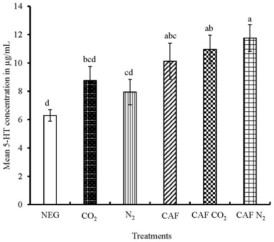 The mean serum 5-HT concentration of the hens in NEG, CO2, N2, CAF, CAF CO2, and CAF N2 were 6.3 µg/mL, 8.8 µg/mL, 7.9 µg/mL, 10.1 µg/mL, 11.0 µg/mL, and 11.7 µg/mL, respectively (Figure 5). The serum 5-HT levels of the spent hens differed significantly among the six treatments (p = 0.0010). The hens in the NEG group had significantly lower 5-HT levels as compared to CAF, CAF CO2, and CAF N2. The serum 5-HT levels of the hens in all treatments, except the NEG group, reflect the serotonergic response of the birds at or after death. The hens in the NEG group were alive longest for a period of four minutes after which blood was immediately collected. The cage might have also induced a fear response in these hens which led to a decrease in the serum 5-HT level. Bolhuis et al. [40] reported higher levels of whole blood 5-HT and less fear response in laying hens selected for low mortality due to feather pecking and cannibalism. However, foam treatments where gases were infused CAF CO2 and CAF N2 did not differ significantly with CAF in terms of mean 5-HT concentration. The 5-HT concentration of spent hens killed by the AVMA-approved euthanasia method of CO2 inhalation was similar to CAF and CAF CO2 treatments, but significantly lower than CAF N2 group. Birds in the N2 inhalation treatment had similar 5-HT levels to CAF, but were significantly lower than CAF CO2, and CAF N2 treatments. Higher levels of whole blood 5-HT was found to be associated with positive mood in human male volunteers [42], while higher concentration of corticosterone indicates higher stress levels [43]. These data may indicate that spent hens in the CAF N2 treatment had a lower anxiety and fear response as indicated by lower 5-HT levels than birds in the NEG, CO2, and N2 treatment groups.