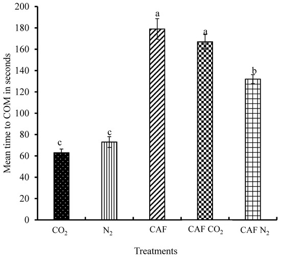 Mean time to cessation of movement of spent hens. The time was expressed in s. Bars (mean ± SEM) with different superscripts (a–c) are significantly different by Fisher’s LSD test (p < 0.05). The total number of samples per treatment was 32.