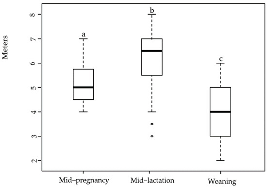 Median, minimum and maximum flight distance (FD) observed at mid-pregnancy, mid-lactation and weaning. Different letters indicate statistical difference (P < 0.05).