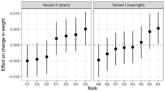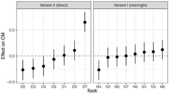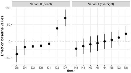 HNB individuals had significantly lower baseline values than HNS birds (effect: −37.8; 95% CI: (−45.4; −30.3)). Three flocks showed significant deviations from mean baseline values in Variant II: two flocks with significant above-average values (D2 and D7) and one with significantly lower values (D6). Any effect that crossed zero did not significantly deviate from the mean baseline value in this flock (Figure 1).