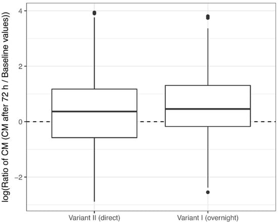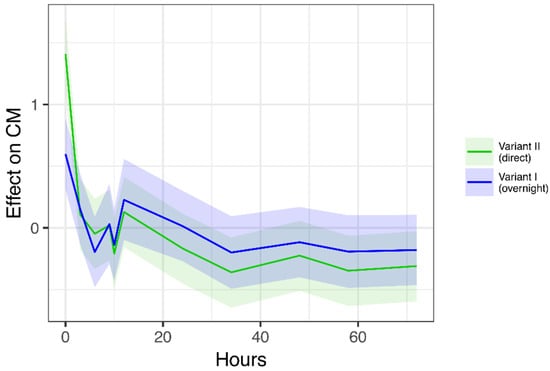 We found no significant difference in CM concentrations between Variant I and Variant II, because the overall trend was similar, and confidence intervals overlapped strongly (effect: −0.208; 95% CI: (−0.567; 0.163)) (Figure 2).