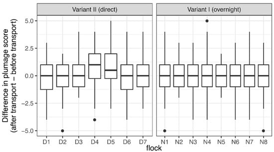 The examined flocks of both transport variants showed an average plumage score of 24.62 ± 1.37 (mean ± SD) before and after transportation, indicating a good feather condition (maximum possible score = 28, for seven body areas with four degrees of severity). Flocks D4 and D5 of Variant II had a better plumage score after transportation than before (Figure 5).