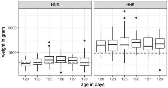 The target weight of the 18-week-old pullets, which is defined by the breeder and distributor H&N International, is set at 1300 g for HNS and 1479 g for HNB. It was not reached by all weighed hens: HNS hens weighed on average 1339 ± 102 g (mean ± SD), and HNB hens 1679 ± 156 g. With age included, no differences could be found within each layer line in reaching the target weight (Figure 7). The only significant effect was the effect of the layer line. The chance of HNS observing a shortfall was on average elevated by a factor of 8.1 (95% CI: (5.1; 12.7)).