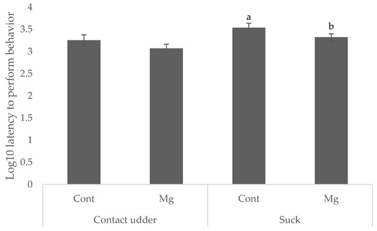 Mean ± s.e.m log10 latency (in minutes) to contact the sow’s udder and successfully suck for piglets born to sows fed a standard lactation diet (Cont) and those supplemented with 21 g/day MgSO4 (Mg) prior to farrowing. a,b Means within behavioral milestone not having the same superscript are significantly different (p < 0.05).