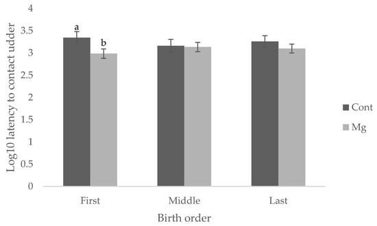 Piglets born to Mg sows were quicker to suck (35.1 min) than those born to Cont (42.1 min and 57.5 min, respectively) as shown in Figure 1 (p < 0.05). Whilst there was no significant main effect of treatment on latency to contact the udder, as shown in Figure 1 (p = 0.119), Mg piglets born first in the birth order reached this behavioral milestone faster (16.1 min) than Cont piglets born first (36.8 min) as shown in Figure 2 (p < 0.05). No difference was observed when piglets were born middle or last in the birth order, as shown in Figure 2 (p > 0.05).