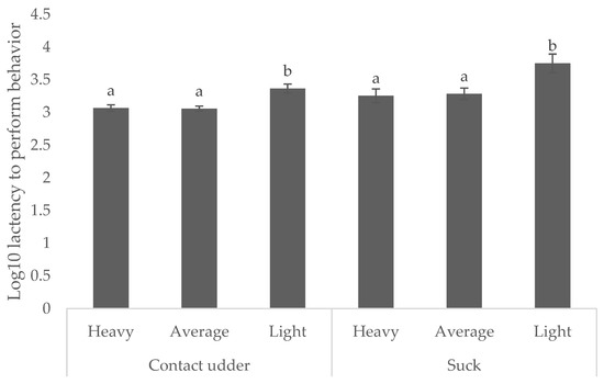 Mean ± s.e.m log10 latency to contact the sow’s udder and successfully suck for piglets classed as heavy (>1.8 kg), average (0.8 to 1.8 kg), and light (<0.8 kg). a,b Means within birth order not having the same superscript are significantly different (p < 0.05).