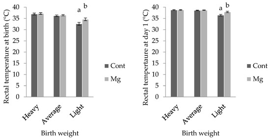 For light weight piglets, rectal temperature was higher in Mg piglets (34.6 ± 0.6 °C) when compared with Cont (32.6 ± 0.6 °C; p < 0.05); however, this treatment effect was not observed in the other weight categories, as shown in Figure 4 (p > 0.05). Similarly, when taken at one day of age, rectal temperature was higher in light Mg piglets (37.9 ± 0.3 °C) when compared to light Cont piglets (36.5 ± 0.3 °C; p < 0.001), as shown in Figure 4. There was no effect of piglet sex on rectal temperature at birth, however at one day of age, females recorded a higher value (38.4 ± 0.1 °C) than males (38.2 ± 0.1 °C; p < 0.05). No other factors were shown to impact the rectal temperature of piglets (p > 0.05).