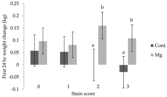 Mean ± s.e.m weight change (kg) over the first 24 h following birth for piglets with no staining receiving a score 0, some staining receiving a 1, moderate staining receiving a 2, and severe staining receiving a 3, from sows fed a standard lactation diet (Cont) and those supplemented with 21 g/day MgSO4 (Mg) prior to farrowing. a,b Means within stain score not having the same superscript are significantly different (p < 0.05).