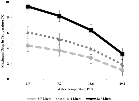 For the experiment, water quantity independently affected maximum reticuloruminal degrees (°C) dropped, whereas water temperature (L), and the interaction were not significant (Table 3, depicted in Figure 1). The overall line equation for this model was: Temperature Decrease = 1.56 + (1.45 × Water Quantity (L)) − (0.003 × Water Temperature (°C)) − (0.04 × (Water Quantity (L) × Water Temperature (°C)).