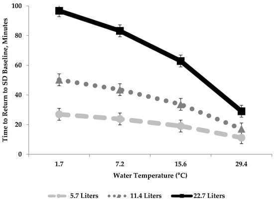 The differences in (LSM ± SEM min) time for water quantity (5.7 L, 11.4 L, 22.7 L), water temperature (1.7 °C, 7.2 °C, 15.6 °C and 29.4 °C) interaction on time required to return to baseline reticulorumen temperature (°C) 1 for feed restricted, once daily drenched pregnant cows (n = 12) explained with the equation: Time to Return to Baseline = 4.33 + (16.06 × Water Quantity (L)) − (0.01 × Water Temperature (°C)) − (0.40 × (Water Quantity (L) × Water Temperature (°C)).