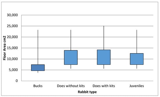 Singly housed rabbits had the lowest median housing size, with bucks having the smallest median housing size overall (Figure 1). All group housed rabbits, with two exceptions, who both housed pairs not groups of rabbits, had a floor area that exceeded the minimum recommended floor area (7500 cm2) for a group of three laboratory rabbits over 10 weeks of age weighing 2.5–3 kg [].