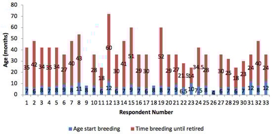 Breeding age and months until cessation of breeding for does shown per breeder.